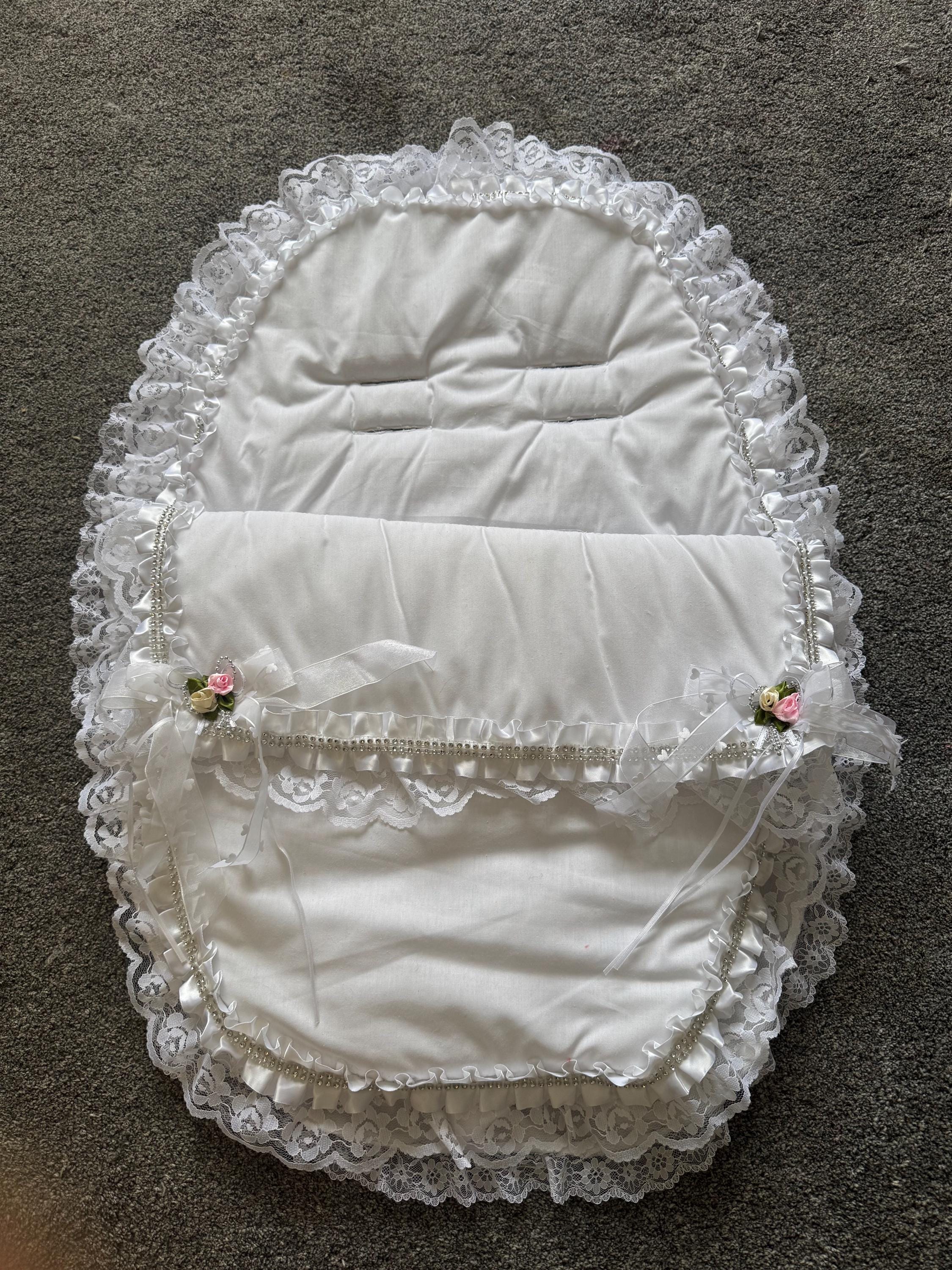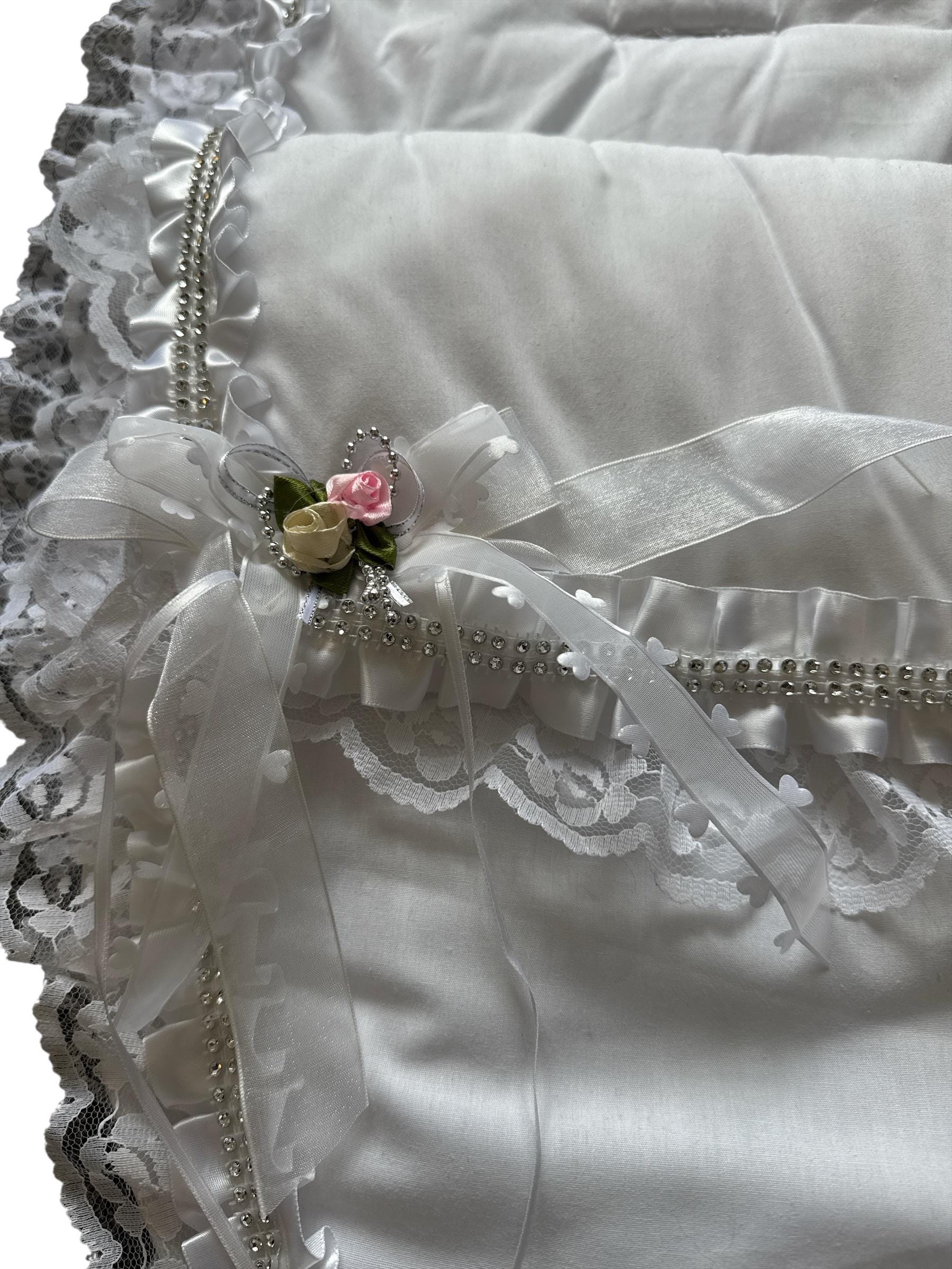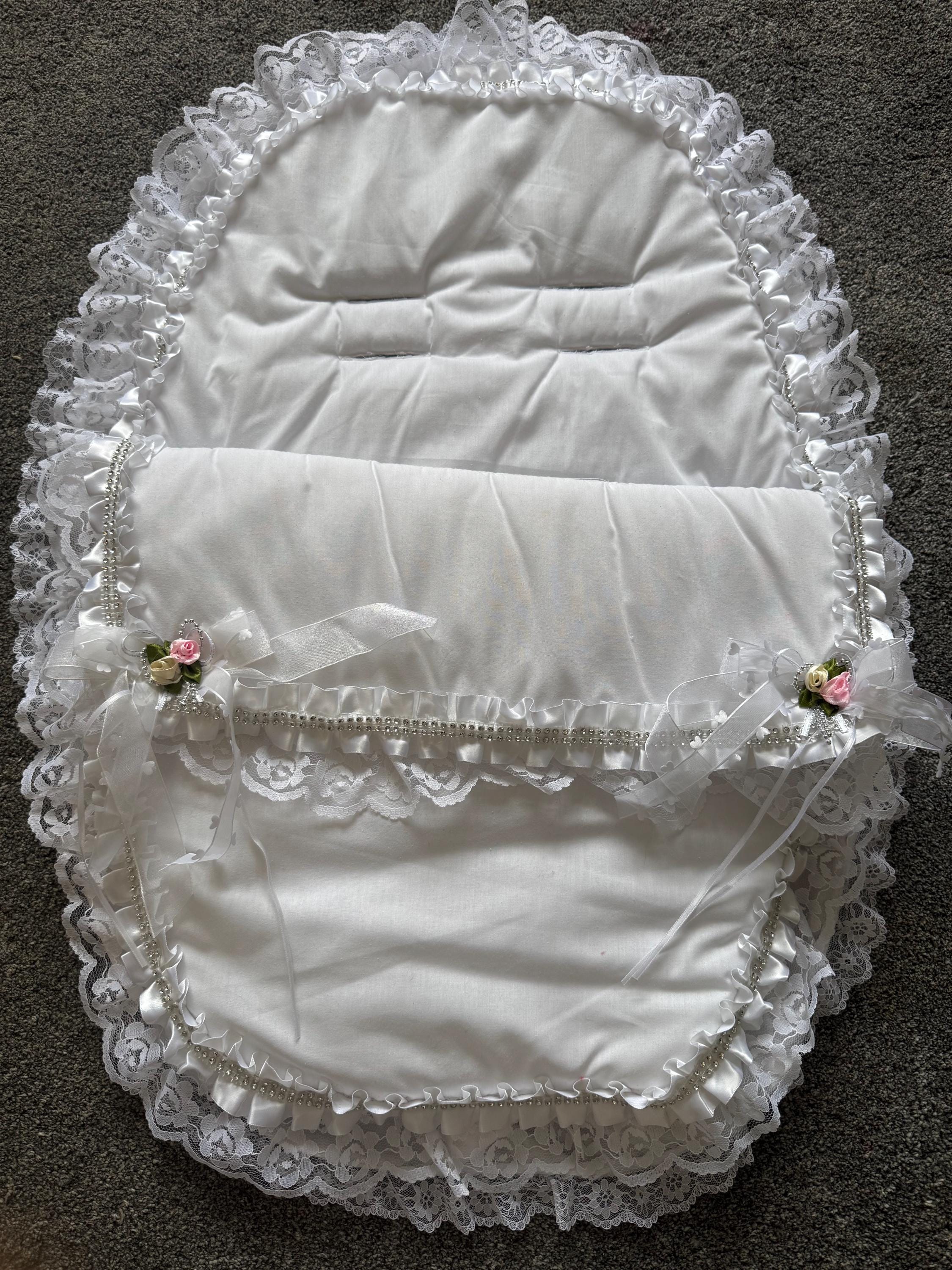 lovely white cosy toes with lots of lace and diamante with satin ribbon flowers