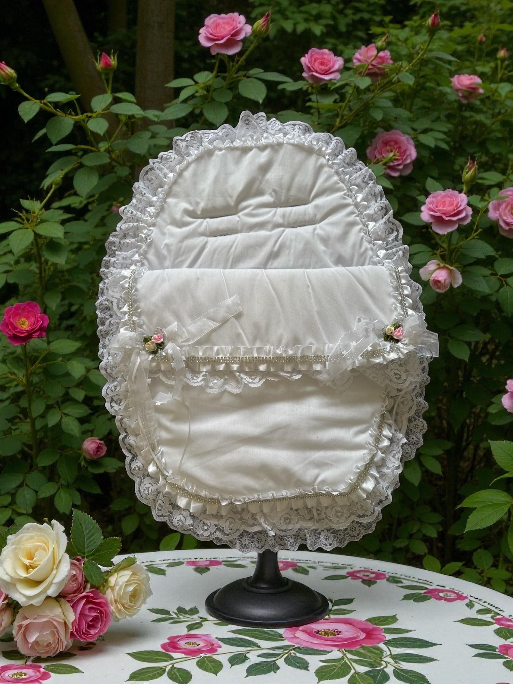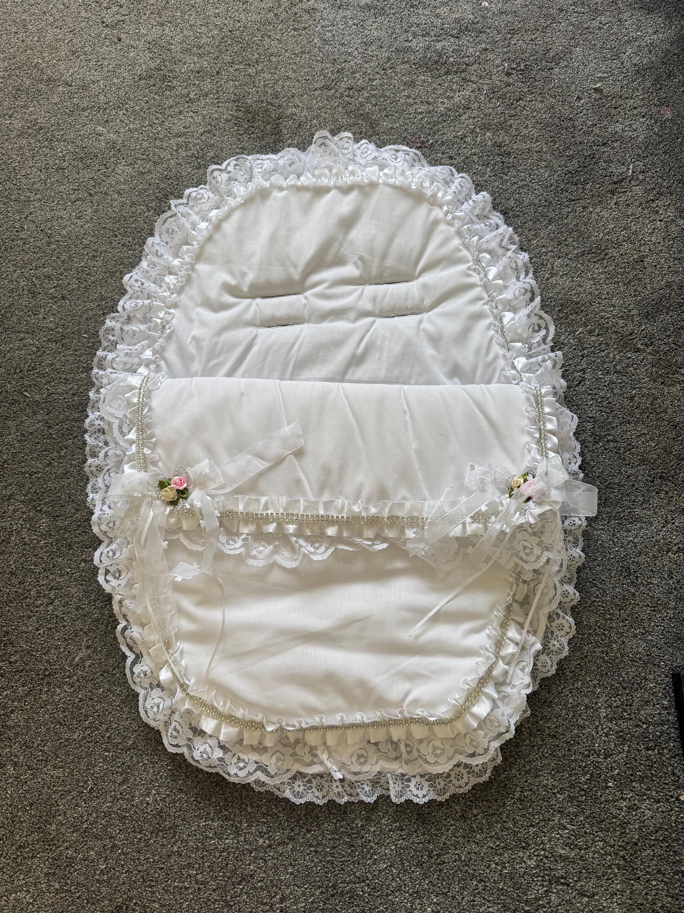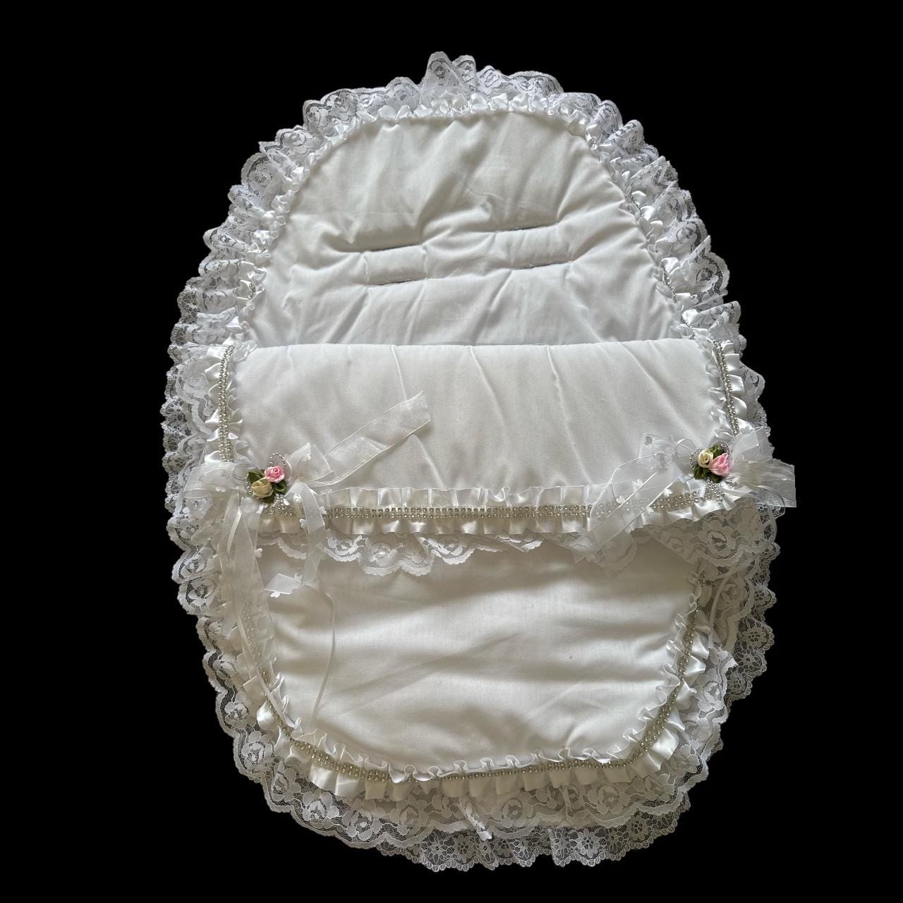 lovely white cosy toes with lots of lace and diamante with satin ribbon flowers