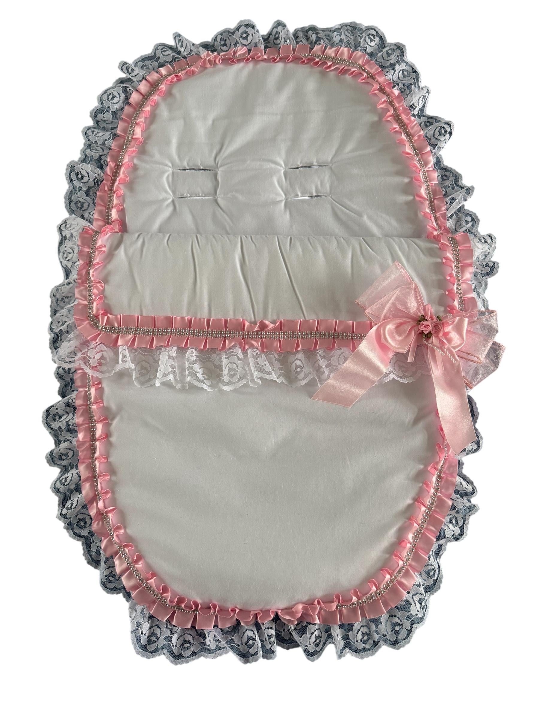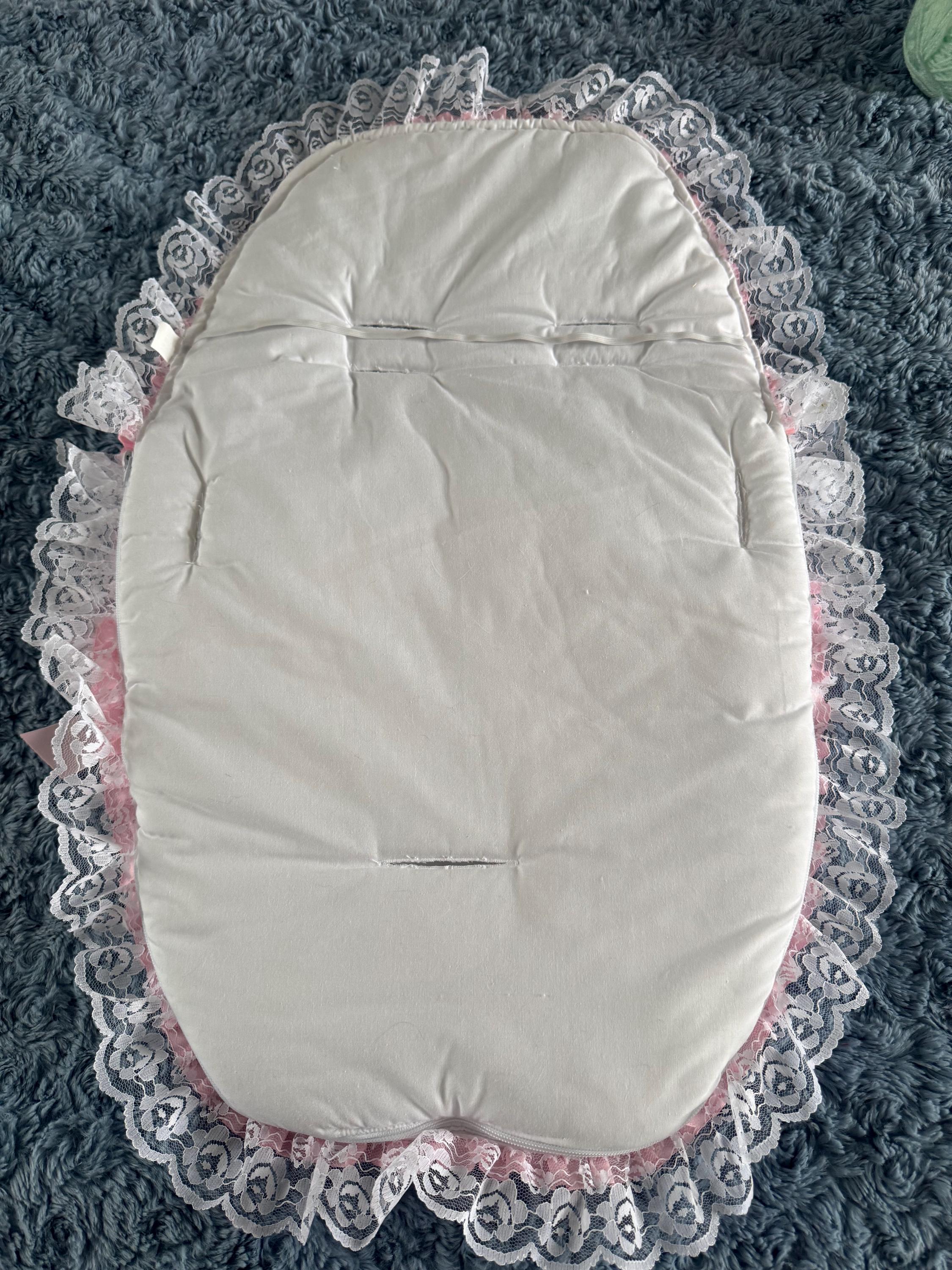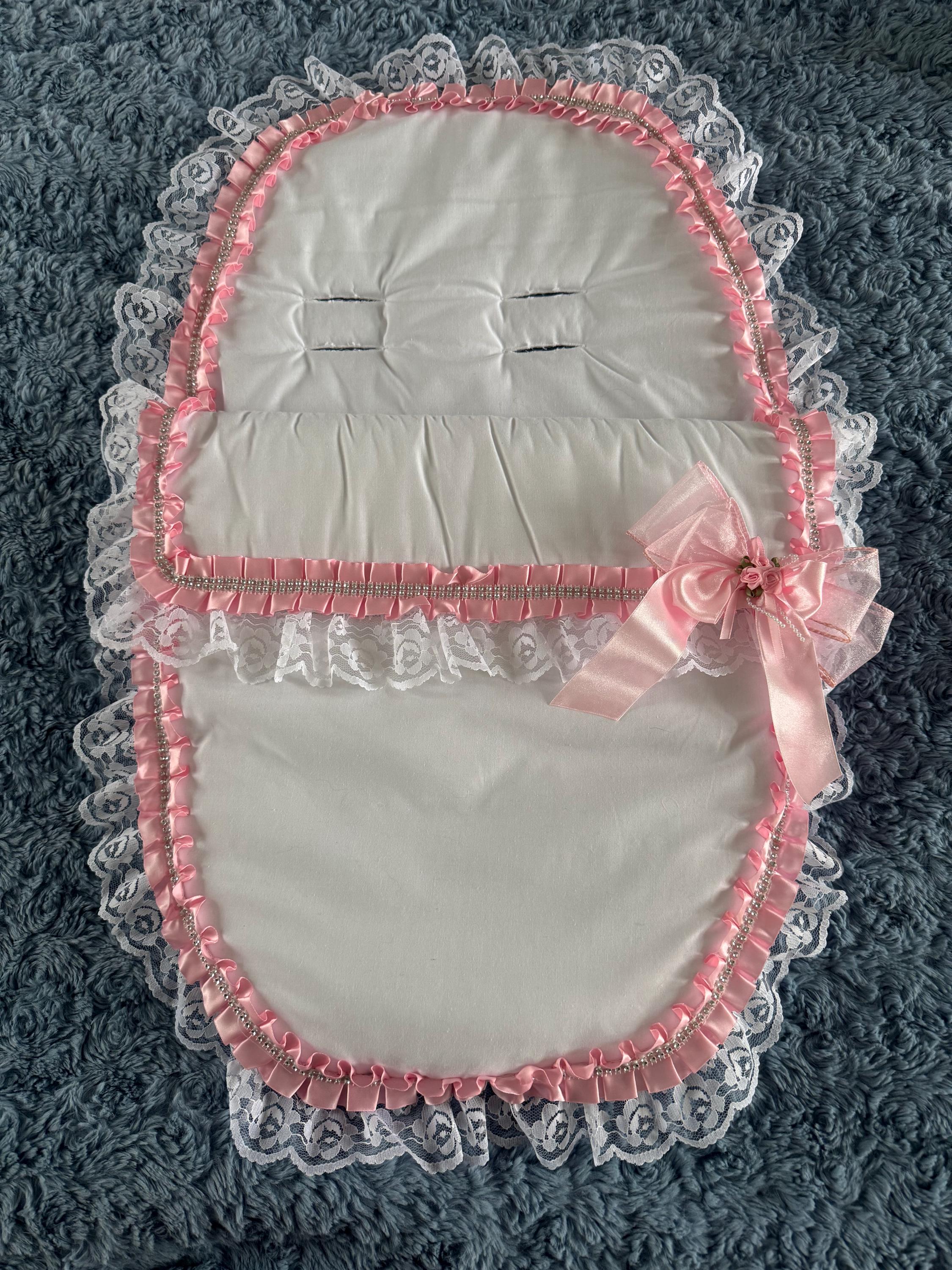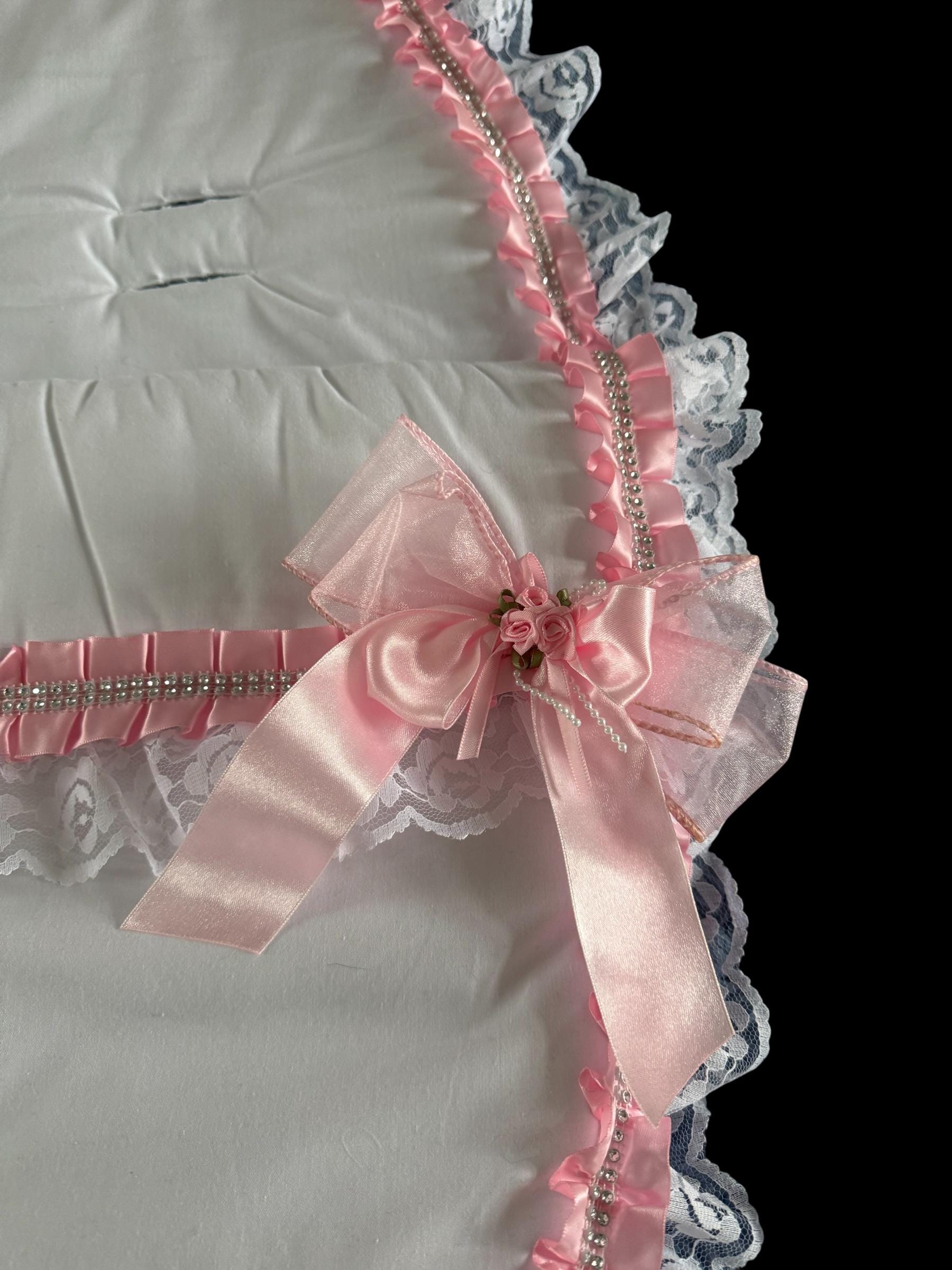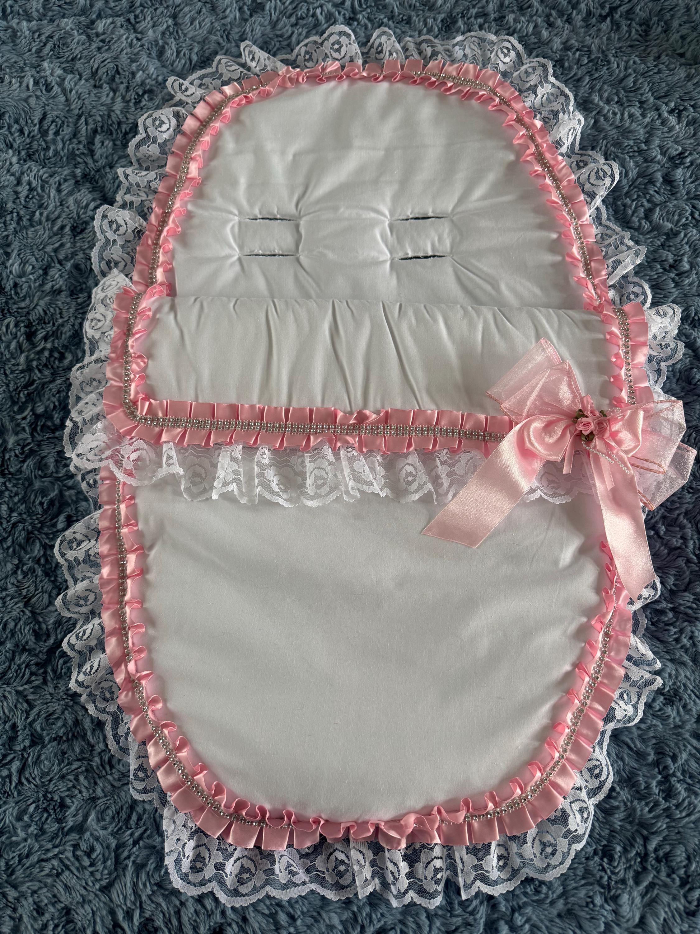 lovely white cosy toes with lots of lace, pink satin ribbon with diamante and satin ribbon flowers